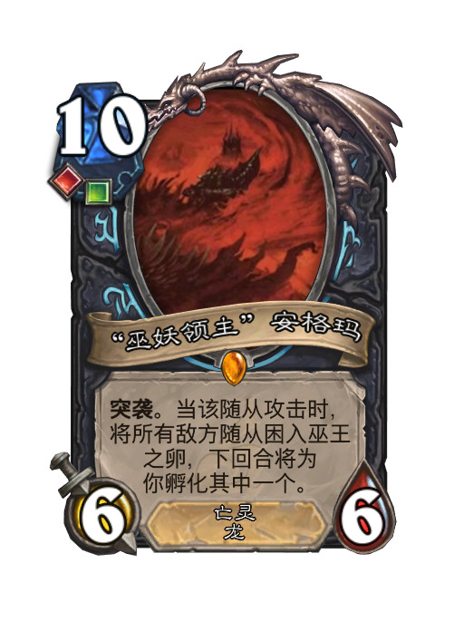 *如果你的场上没有“巫王之卵”,安格玛会在攻击时召唤一个,它占据你的一个随从位。当被困的随从全部被召唤,“巫王之卵”便会消失。