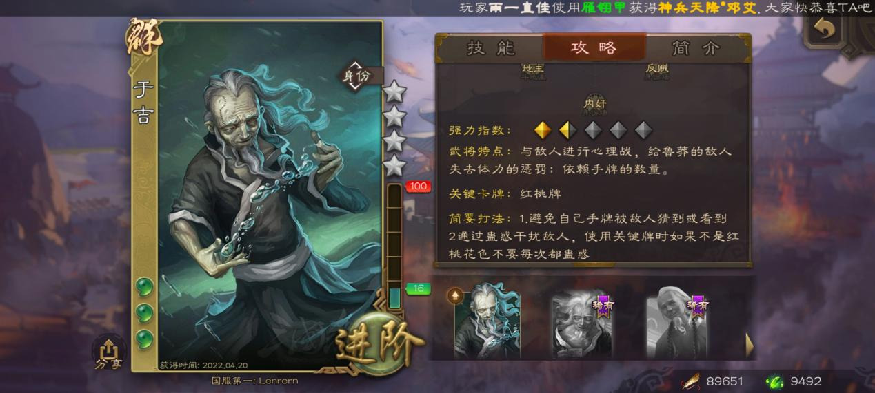 这个武将的强度不太好评价,毕竟玩的就是心理战术,有时候遇到头铁的玩家有奇效,当然也可能会非常废。不管怎么说,于吉的操作空间是很大的,关键在于玩家自己如何去使用以及其他玩家如何选择应对。