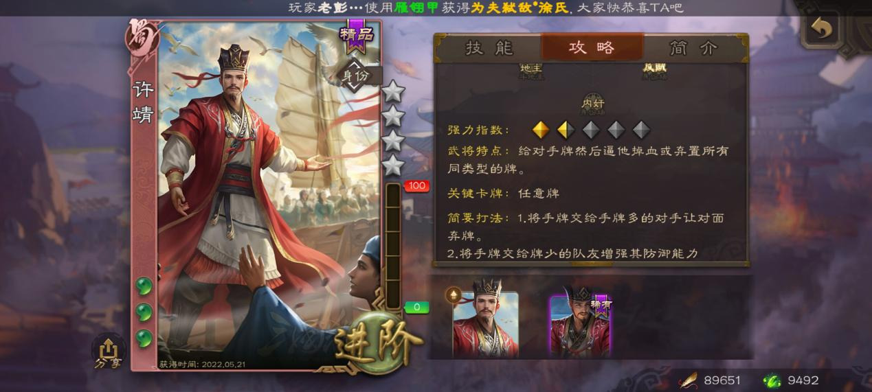 他的技能【博名】有点类似于刘备的仁德,回合内可以给出两张牌,然后自己摸一张牌。该技能又和他的另外一个技能【恶荐】是关联的,拿到许靖给出的牌后,如果自己手上有和这张牌同类型的牌,那就会触发掉血或者弃牌的负面效果。许靖的两个技能组合起来其实有些类似周瑜的反间,然而实际上这个武将即不如刘备也不如周瑜好用,一星半的评价完全没毛病。