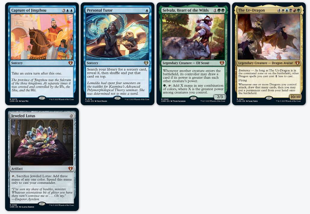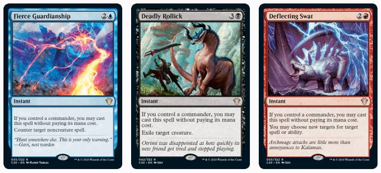 格力极三色的三个指挥官替费是目前这个循环里用得最多的,它们现在的生态位有点类似于之前的码头勒赎手,(几乎)只有预组才有(聚珍可以开出微量),而且没有简中版本。不仅从缓解需求量的角度,还是促进产品销售的角度,这三张都应该在指挥官大师里重印,而且考虑到它们异能的独特性(和珠光莲花一样是和指挥官互动的),它们也就只能在指挥官大师这样的系列印了。