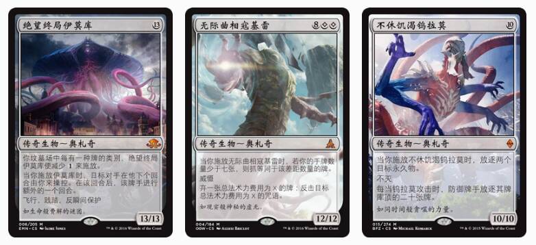 也该印了吧,这三个自从首次出场就再没印过,除了钨拉莫在秘室珍品里单飞过一次(另外它在指挥官里可能也是这三位里“最不厉害”的一个)。它们仨的初版则是被溜溜重印过三次(摩登大师2015、终极大师、双星大师2022),而且万世创伤伊莫库是指挥官禁牌,所以总归是不能再重印了。还是考虑到奥札奇主题预组的存在,主系列里一定会有不少重印的奥札奇,重印这三个新版奥札奇泰坦看起来合情合理,也是众望所归。另外,这次新出的预组封面传奇奥札奇祖禄铎也很耐人寻味,这个角色似乎从未在故事中出现过,而有名有姓的奥札奇从来都只有三枚(融合的姐妹俩和拔地而起的翰威城就不算在内了)。在号外系列推出的新传奇角色有可能成为推动未来剧情发展的关键,上一个鲜活例子是摩登新篇空降的超人气鹏洛客芮恩,要不是回炉(土)重造了,剧情上一度有接替妮莎的趋势。所以这个突然安插在指挥官大师的奥札奇是不是也会成为后续剧情的核心呢?看它一脸纯良模仿观音坐莲的样子,是不是要“洗白”奥札奇呢?