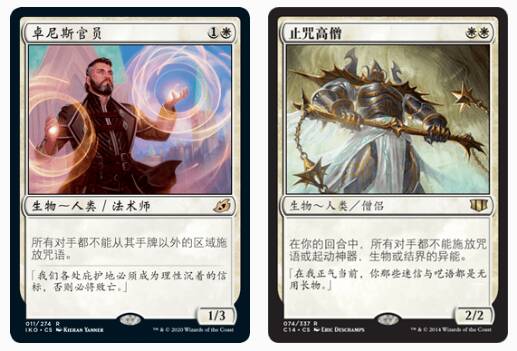 我和大部分玩家一样都不太喜欢这类单卡,自己也基本上不去使用,不过不能否认它们在指挥官赛制中有一席之地,不让对手玩痛快确实也是指挥官的一部分。我不太清楚在指挥官系列中印类似的破坏其他玩家体验的单卡是不是符合威世智推广指挥官赛制的精神,而且在轮抓(这个系列和征战博德之门以及更早的指挥官传奇一样有指挥官轮抓,正常情况下来讲是四人一局的)里二费拍一个官员卡住所有人的主将确实可能有点不平衡,不过官员也有段时间没有印过了(毕竟它和馈击横扫、狂热守护是同一个版本推出的)。止咒高僧这边和左边相比起来反而更温和一点,类似效应的牌也不止它一个,它最近在秘室珍品印过。