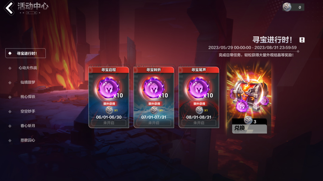 作为目前仍在继续的活动,“寻宝进行时!”以月为单位划分了三个阶段,每个阶段通过刷和肝来完成日常任务,即可获得外观结晶“十连抽”。累计3个阶段的目标全部达成,还可用获得的“恒心勋章”兑换终极宝箱“恒心宝藏”。终极宝箱可开出外观结晶“十连抽”、200碎裂原晶等丰富奖励,主打的就是一个轻松拿奖励!