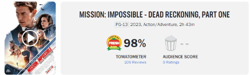 影片烂番茄新鲜度98%。整体口碑相当可观。在《碟中谍》系列中,本片仅次于《碟中谍6》(86分),高于《碟中谍5》(75分)《碟中谍4》(73分)。