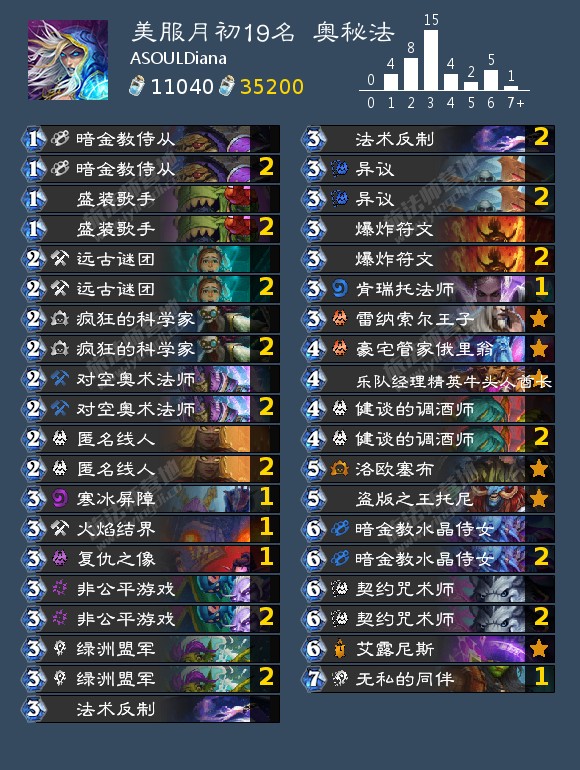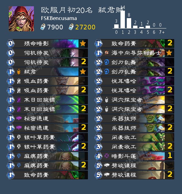 3. 卡组投稿可以私讯(优先在b站跟燁魔联络),或请大家把自己的卡组放到群帖子,要求是各服排名前200(因为外服人少,所以排名要求会比较高),并且附上卡组代码、卡组图、排名截图和胜败统计(最好是附上全职业对阵阅览的那种),场次不能低于20场,胜率不能是负的,如果没有胜败统计就附上d0nkey的排名历史纪录。如果同步分享卡组到自己的b站推特,建议标上标签 #狂野卡组#、#WildHS 让我们方便找寻。有任何想补充的(留牌、对局分析、打法等等)可以尽量附上
