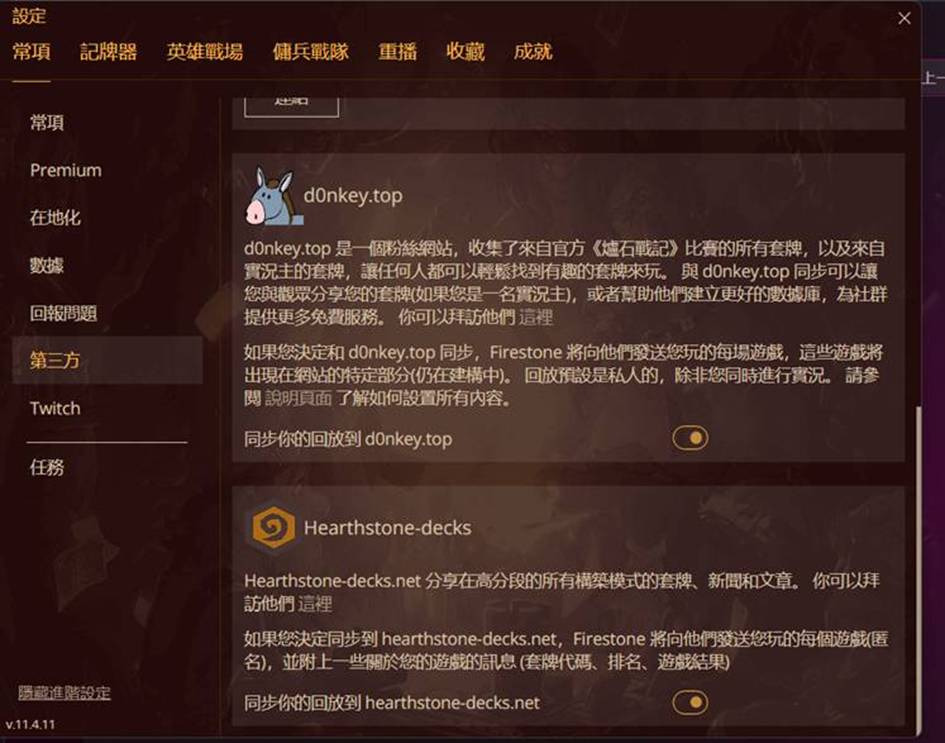 另外我们拿到了firestone内部的狂野前200名玩家的对局资料了,就像neon31和d0nkey收集的资讯一样。这些资料对我们狂野日报组来说,更能收集的到一些高分玩家的卡组资讯,欢迎大家在firestone这边进行设置,与我们共享你们的对局资料,如果你不好意思把资料共享给我们,也可以选择退出。