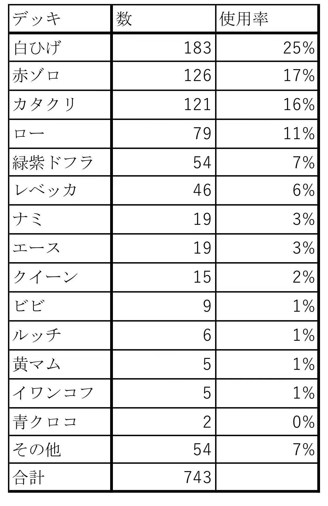 注:本次爱知大会合计参赛人数应为1271,图表统计到的卡组数为743,姑此统计数据并不能完全反应本次大赛的meta结构,但因样本数量足够多,具备一定代表性和参考价值。