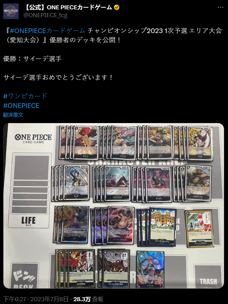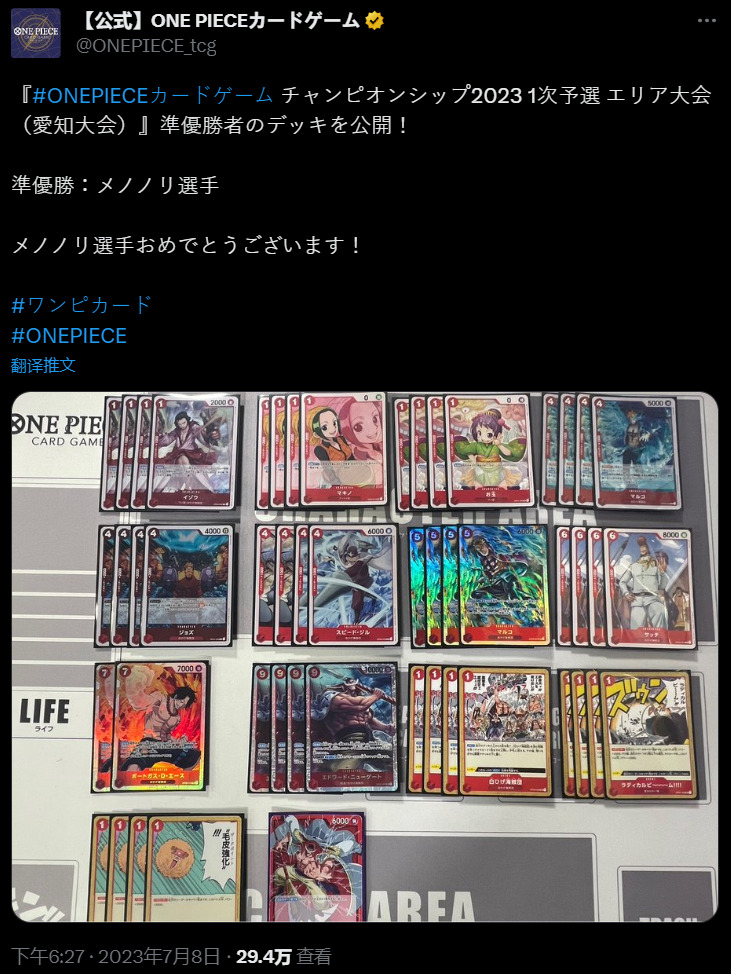 硬塞了6张去除事件的索隆,如果算上大马和两张花剑,合计去除点来到了12张。主轴依然偏白团,整体打法和常规白团轴索隆不会有太大区别,但解场端的处理手段更加丰富。