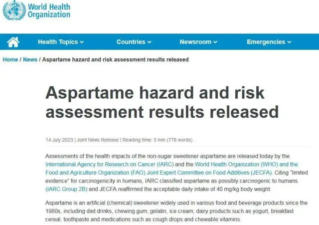 据世卫组织官网14日消息,国际癌症研究机构(IARC)、世界卫生组织(WHO)和粮食及农业组织食品添加剂联合专家委员会(JECFA)今天发布了阿斯巴甜对健康影响的评估结果。