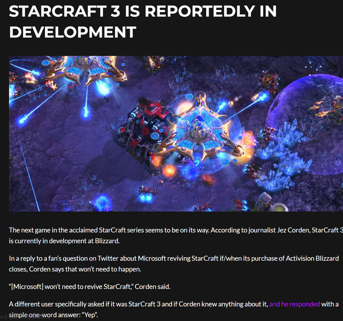 在Twitter上当被问到如果微软收购了动视暴雪,是否会复活《星际争霸》时,Corden称那不需要发生。