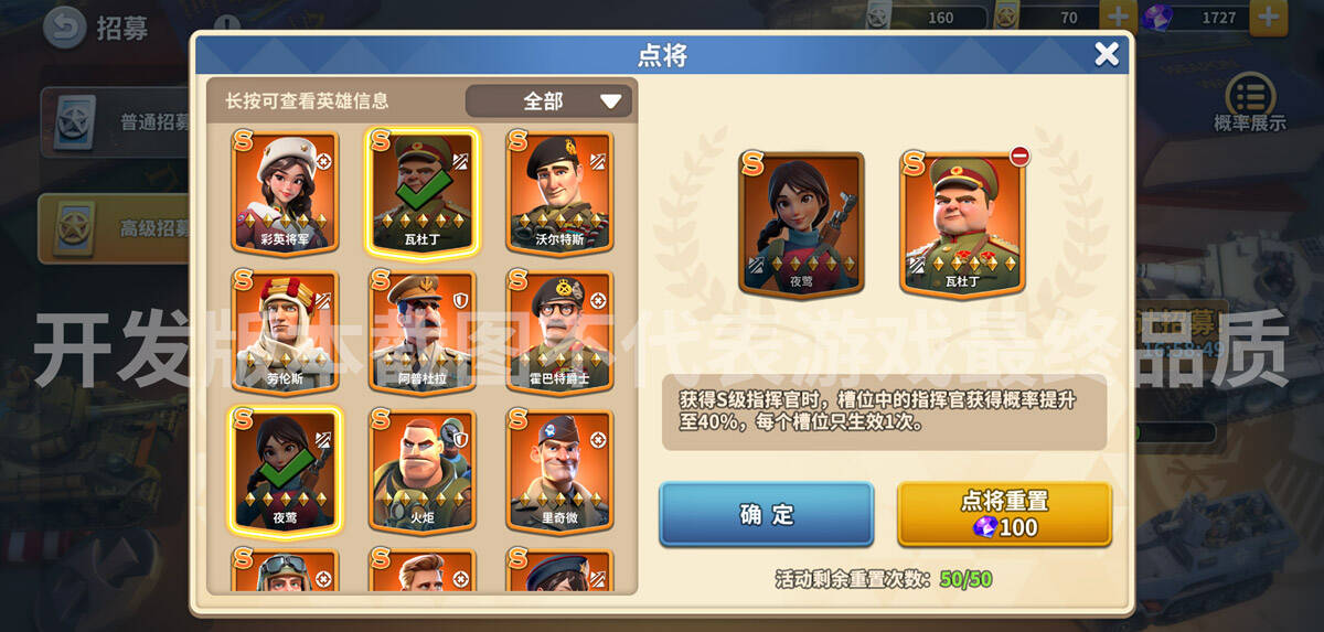解锁该玩法后,统帅可在点将列表中设置1-2位指挥官。当高级招募获得S级指挥官时,被选中的指挥官抽中概率提升40%!点将列表每隔一段时间会自动重置,招募活动期间还可以手动刷新。