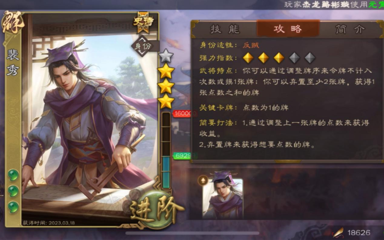 因为裴秀可以一边用牌,一边记录点数,使得他十分灵活。原版的裴秀很容易卡住手牌,新版点数可以随时变化,相当于界沮授的【渐营】,只是新增了一个变花色效果,但过牌能力提升许多。此外,新版配有完全兼顾了过牌与爆发。原版裴秀只能偏向过牌或者爆发。如果记录6左右的数字,虽然可以过牌和爆发,但是能力不突出,新版裴秀每次使用牌都能记录,先使用一张大点数,然后使用小点数,此时可以摸一张牌,然后使用大点数,可以无次数限制,之后再使用小点数,又可以摸牌,如此循环。