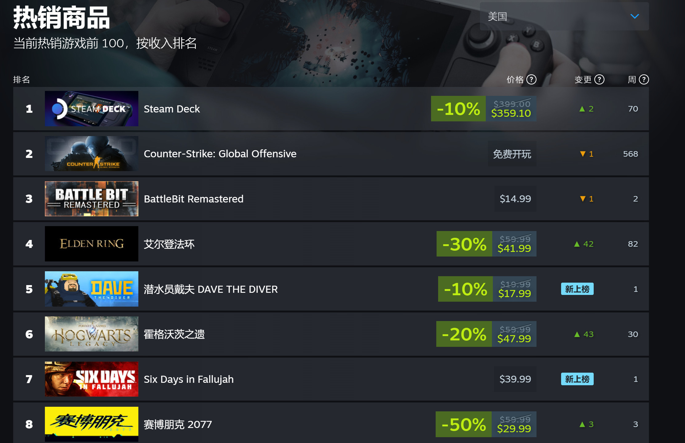 除了《艾尔登法环》外,热销榜上的其他游戏还有像素版战地《BattleBit Remastered》、《潜水员戴夫》、《霍格沃茨之遗》、《费卢杰六日》、《赛博朋克2077》、《使命召唤19》、《荒野大镖客2》、《森林之子》、《星球大战绝地:幸存者》等游戏。