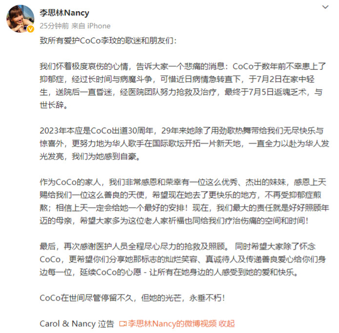 7月5日晚间,李玟姐姐李思林发文称李玟去世。李思林透露CoCo于数年前不幸患上了抑郁症,经过长时间与病魔斗争,可惜近日病情急转直下,于7月2日在家中轻生,送院后一直昏迷,经医院团队努力抢救及治疗,最终于7月5日返魂乏术,与世长辞。