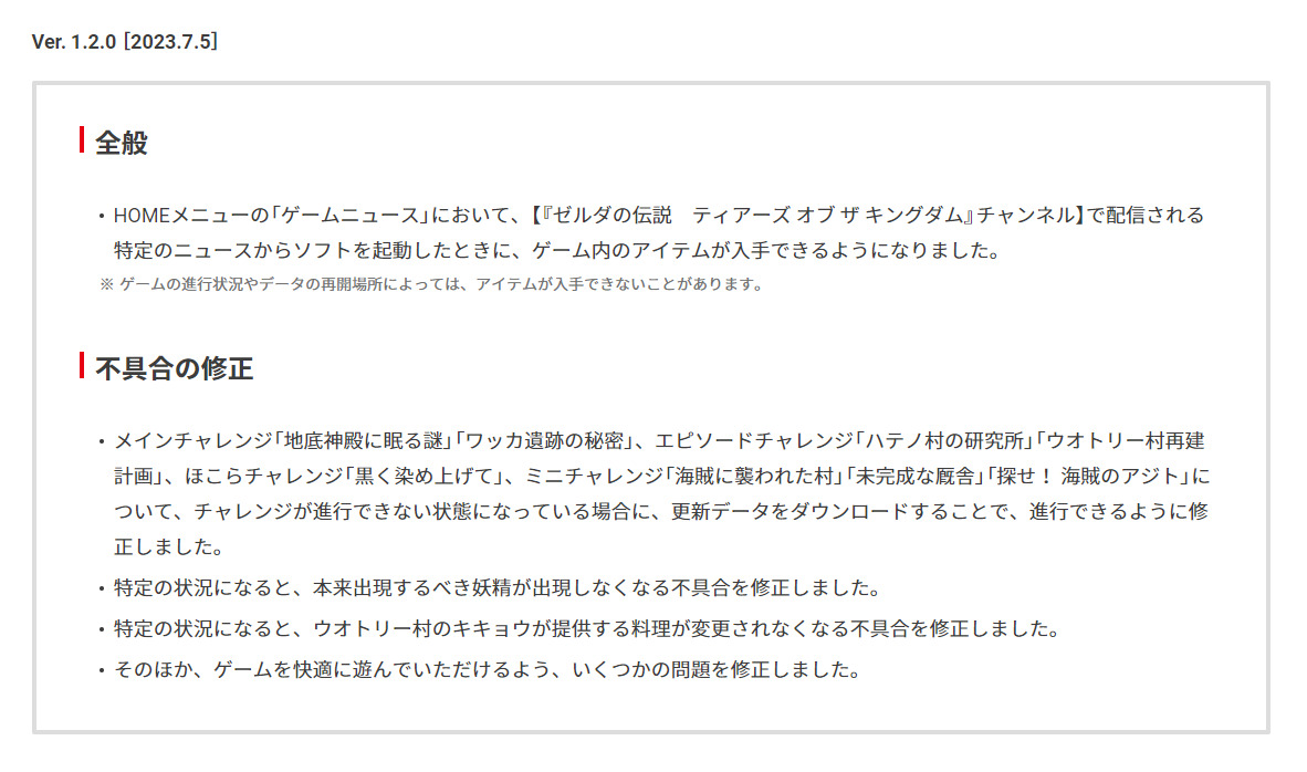 7月5日,任天堂发布了《塞尔达传说:王国之泪》1.20版本更新,添加了一个新功能:玩家在HOME菜单“游戏新闻”页面中通过《塞尔达传说:王国之泪》频道发布的特定新闻启动游戏时,可获得游戏内道具。