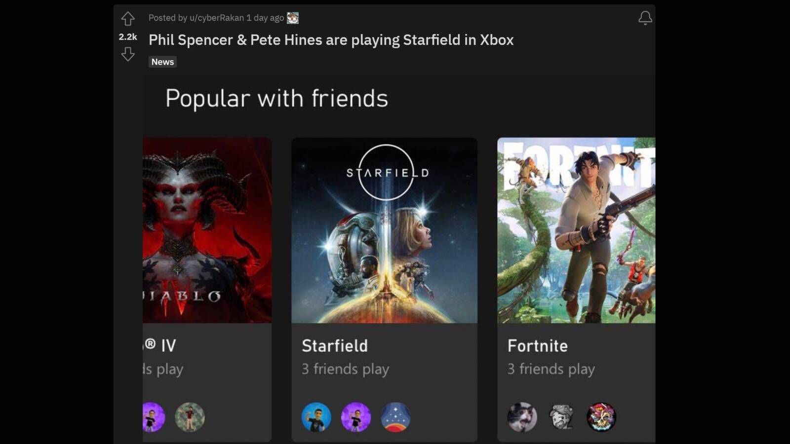 当玩家们还在为《暗黑破坏神4》第一赛季做准备,或准备游玩《博德之门3》时。微软和B社的一些人已经开始玩《星空》了。近日国外Reddit论坛一位网友发现,他的好友列表显示Xbox老大Phil Spencer和B社高级副总裁Pete Hines已经玩上了《星空》。