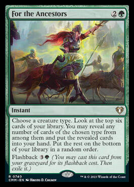 选择一个生物类别。检视你牌库顶的六张牌。你可以从中展示任意数量具所选类别的牌,然后将所展示的牌置于你手上。将其余的牌以随机顺序置于你的牌库底。