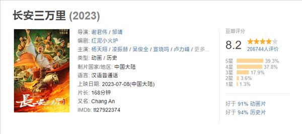 上映之后,《长安三万里》口碑一路飙升,目前豆瓣评分已经高达8.2,是今年最好评价之一。