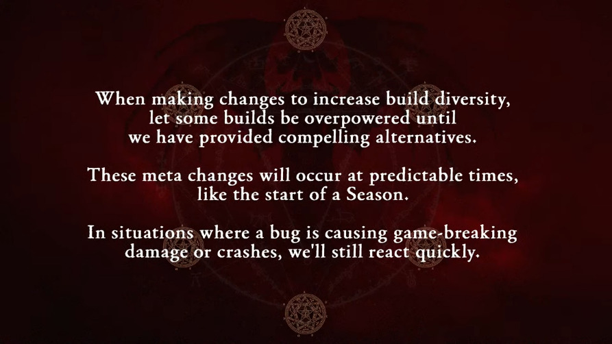 游戏团队对玩家进行了一些承诺,表示未来在试图增加玩家玩法多样性时,会让一些玩法套组继续强力,而团队将试图制作吸引人的其他替代玩法,而不是急于削弱。同时,版本强力玩法/流派(Meta)发生改变的时间将会更加可以预测,而不是突然进行大削,时间点例如新赛季开始的时候。不过,在游戏 Bug 导致太过破坏平衡的伤害或导致游戏崩溃时,官方保证将继续快速应对进行修复。