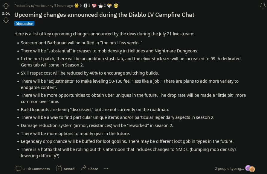 今天(7 月 22 日)早些时候,暴雪《暗黑破坏神4》的制作团队举办了此前承诺的篝火会谈直播,以试图安抚玩家在 1.1.0 更新后的不满情绪,并向玩家解释游戏未来的一些计划。