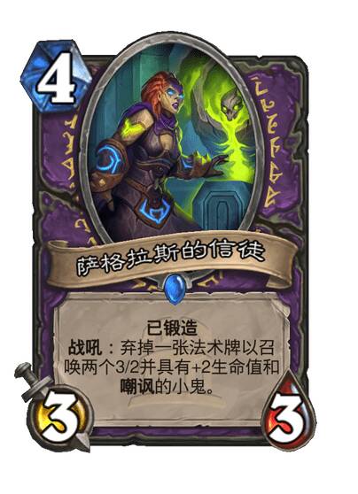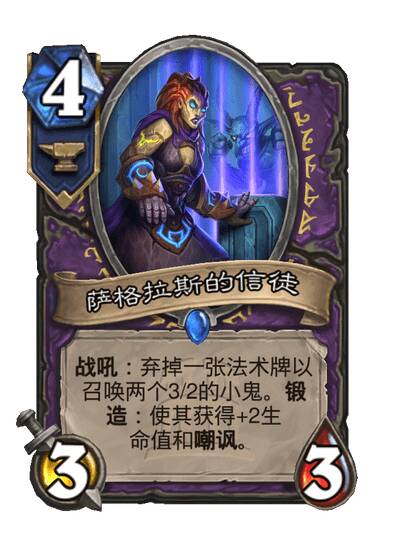 战吼:弃一张法术牌以召唤两个3/2的小鬼。锻造:使其获得+2生命值和嘲讽。