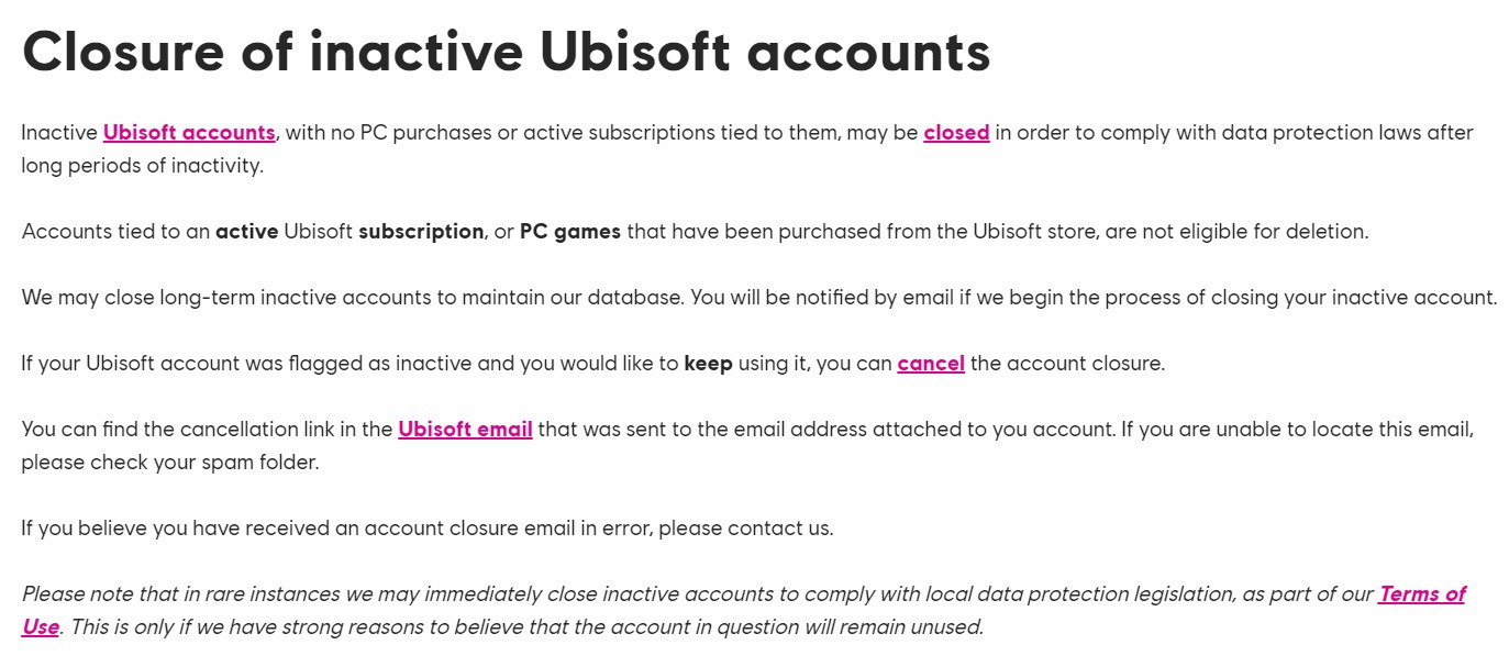 这也引发玩家们的担心,不过现在育碧支持页面已经更新为“与有效育碧订阅相关的账号,或从育碧商店购买了PC游戏的账号,是不会被删除的。”