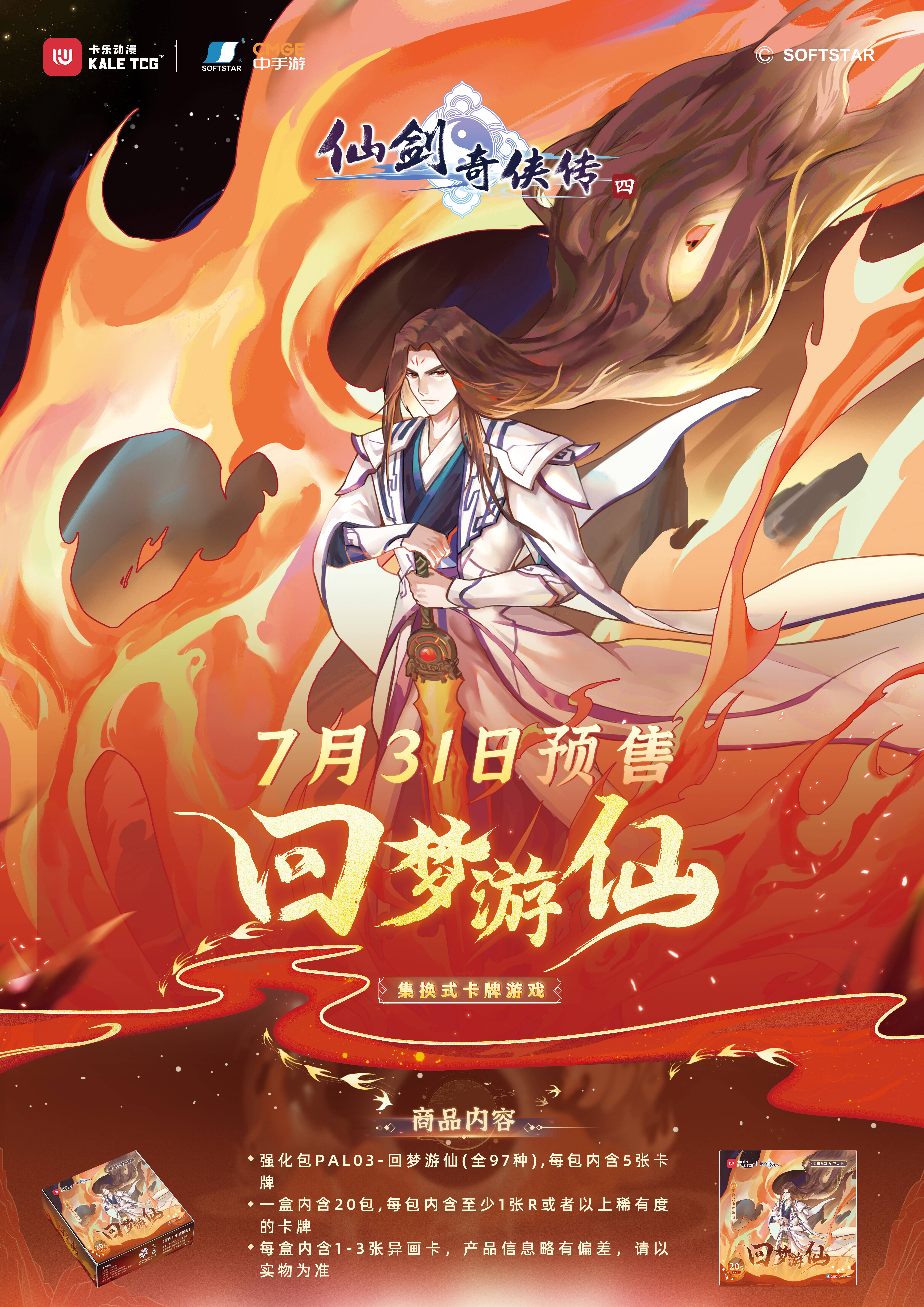 由仙剑奇侠传正版授权,卡乐动漫推出的《仙剑奇侠传四》集换式卡牌游戏第三弹—回梦游仙,将于2023年7月31日正式开启预售!