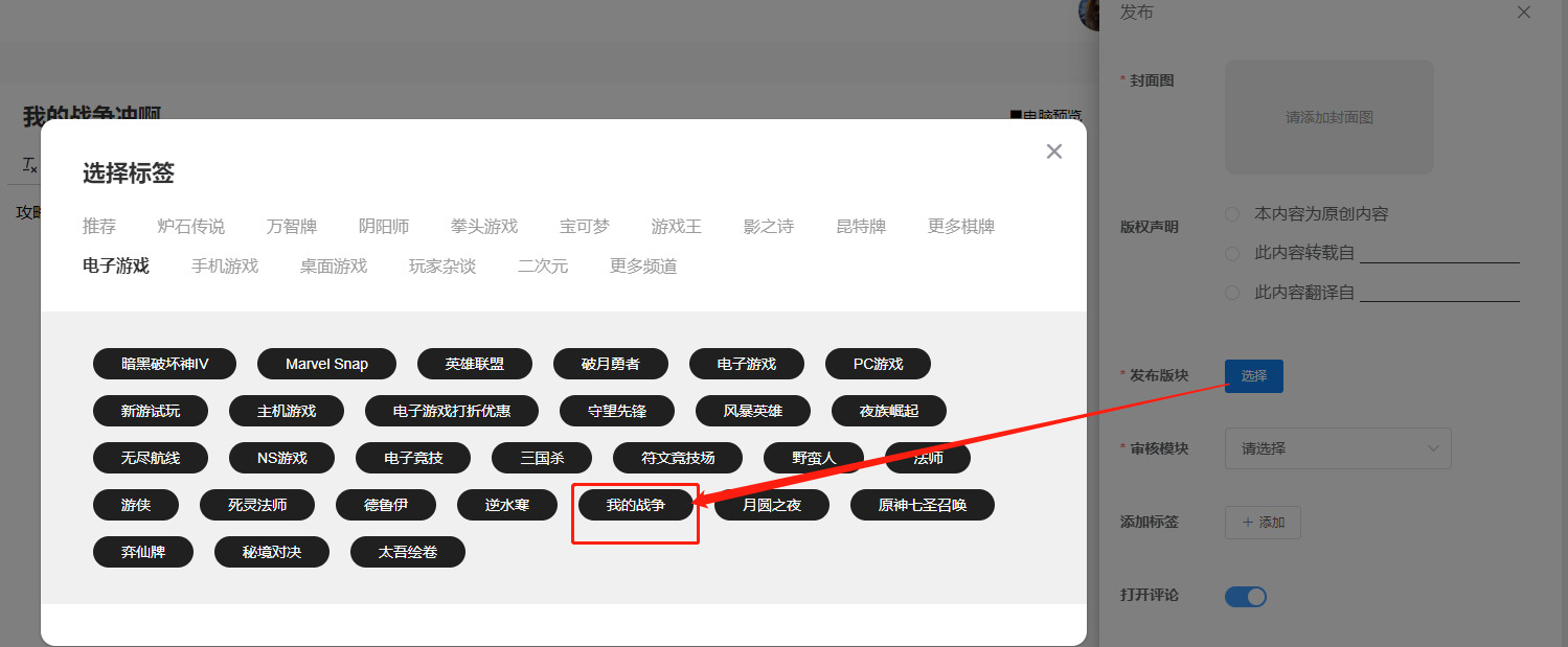 3、添加“我的战争”话题标签(电子游戏-我的战争)