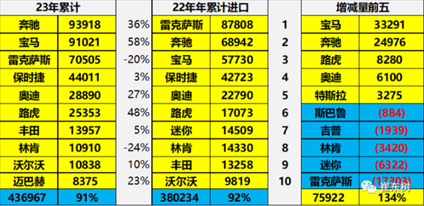 而奔驰、宝马份额持续增长,奔驰2023年已经成为进口车品牌第一,宝马排名第二。奔驰、宝马2023年上半年累计进口销量均超过9万辆。
