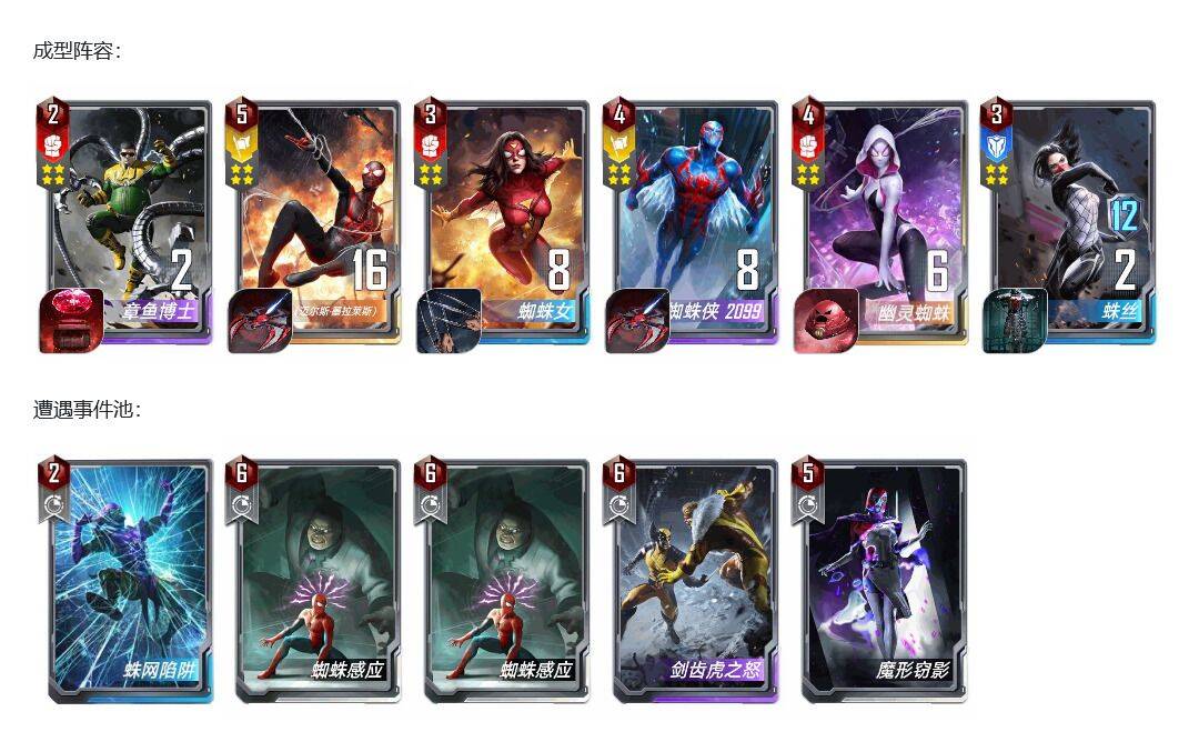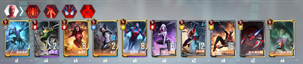 4回合:留三本搜。尽量按以下阵容买。5回合:升四本,搜2099和幽灵蜘蛛,拿到幽灵蜘蛛可以卖罪恶先生和蟾蜍,章鱼博士和蜘蛛女2+1都行填满站场。