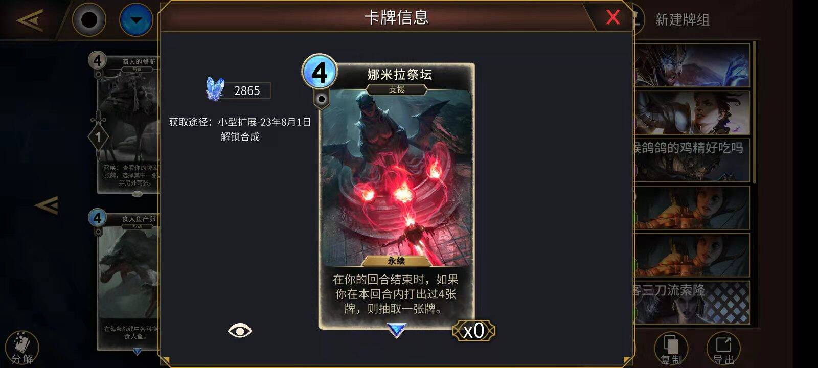 打4才抽1,就意味着适配性最高的就是过牌最多的绿色了,但是4费下场意味着空过,还和市场抢支援格子,最最关键的一点是,如果这张牌是:你在本回合每打出4张牌就可以抽1张牌。的话还可以。有的人可能要说了,就算是这样一回合大概率也是只能过一张啊,区别是什么呢?关键性的区别在于,现在这个效果是回合结束时才抽牌,它没有及时性,抽到的牌只有下个回合才能用,对于现在快节奏的版本来说这两点差距会非常大。