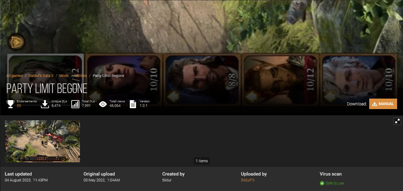 这个 Mod 名叫“Party Limit Begone(队伍限制解除)”,将允许玩家队伍中最多有 8 名角色。下载非常简单,如果你未曾使用过 Nexus Mods 网站,只需要注册一个免费账号,并通过网站下载 Mod,并手动解压至《博德之门3》安装文件夹下的 Data 文件夹中。