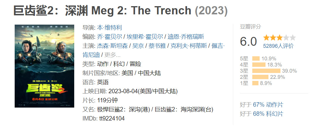 不过从2018年上映的第一部《巨齿鲨》电影来说,这种类型的电影几乎就是个爽片,故事内涵之类的东西不是重点,剧情多少都是有硬伤的,这是怪兽类电影的通病,设定怪兽很强大,但是又伤害不了主角团,毕竟有主角光环加成,再强大的怪兽也要被人类毒打一顿。