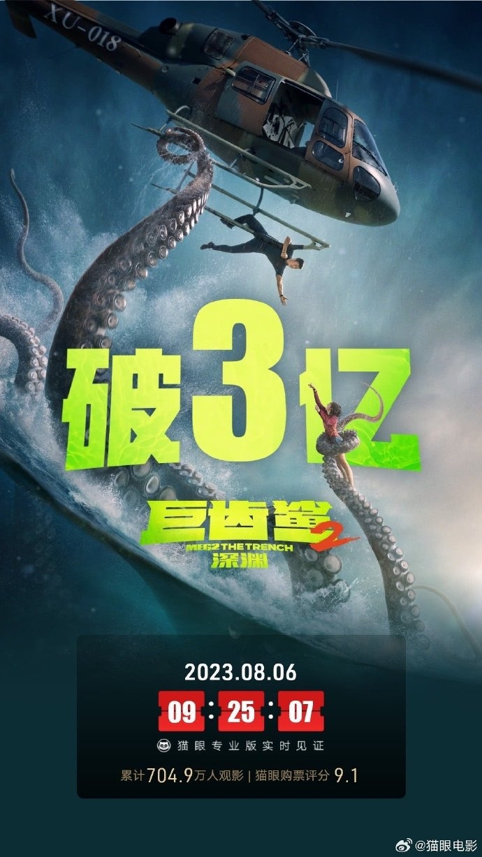 吴京首次主演的海洋怪兽类电影《巨齿鲨2》上映三天,截至8月6日9点25分,总票房突破了3亿,累计704.9万人观影。
