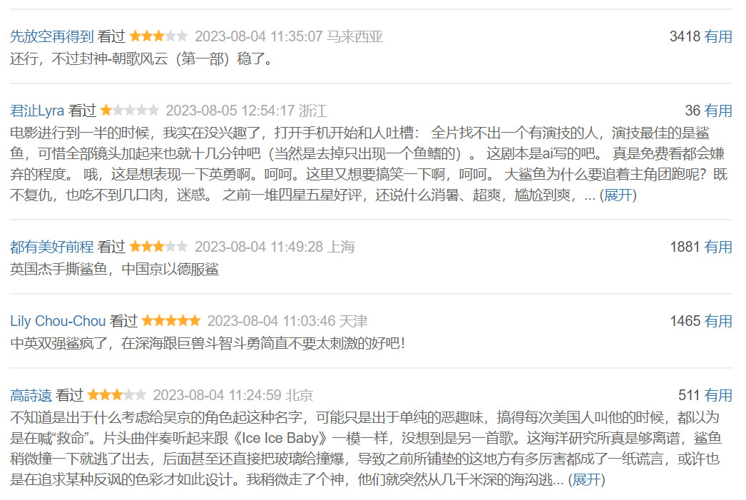 网友的评价中三星居多,五星、一星都在10%左右,三星评分占了40%左右,其次是4星评价,网友的意见分化的也比较多,有说吴京、斯坦森不搭的,也有说看着过瘾的。