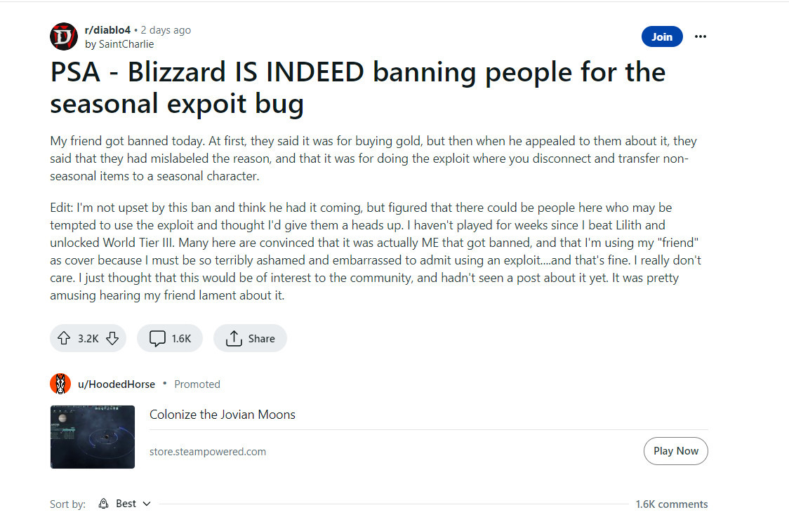 在《暗黑4》Reddit子版块上,一名玩家发出警告贴,称自己的朋友因为利用这一漏洞被暴雪封号。