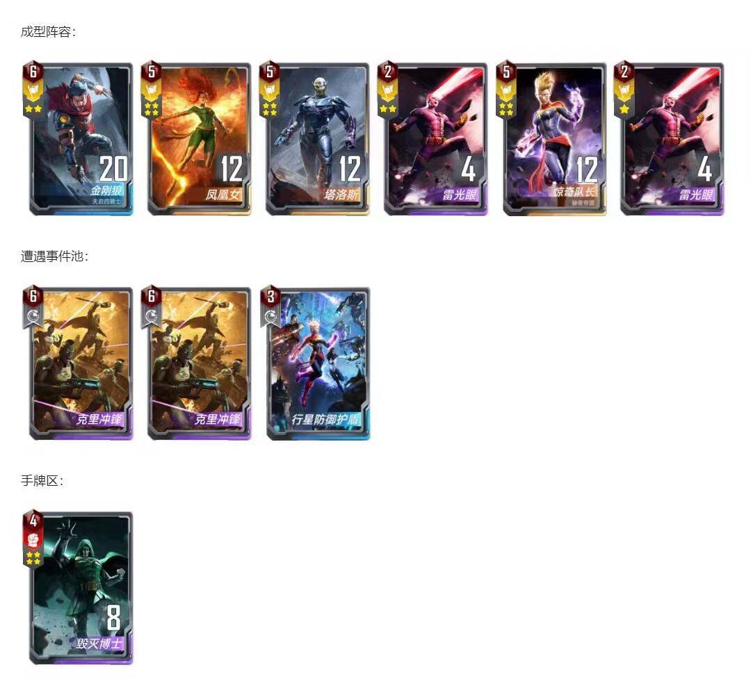 这个阵容专打大身材卡组,后期基本是不靠凤凰链接的所以不需要暴风召唤,雷光眼凤凰触发太多次把对面身材打到一百以下我们反而会输。遭遇区要给行星防御护盾留三个卡位,如果对面不贴膜可以留一张风暴召唤一张克里冲锋。留两张克里冲锋的情况即使对面双贴膜我们理论上也能摧毁他16次,况且还有六狼搏上限。记得把雷光眼分开放防止被钢铁侠一锅端。