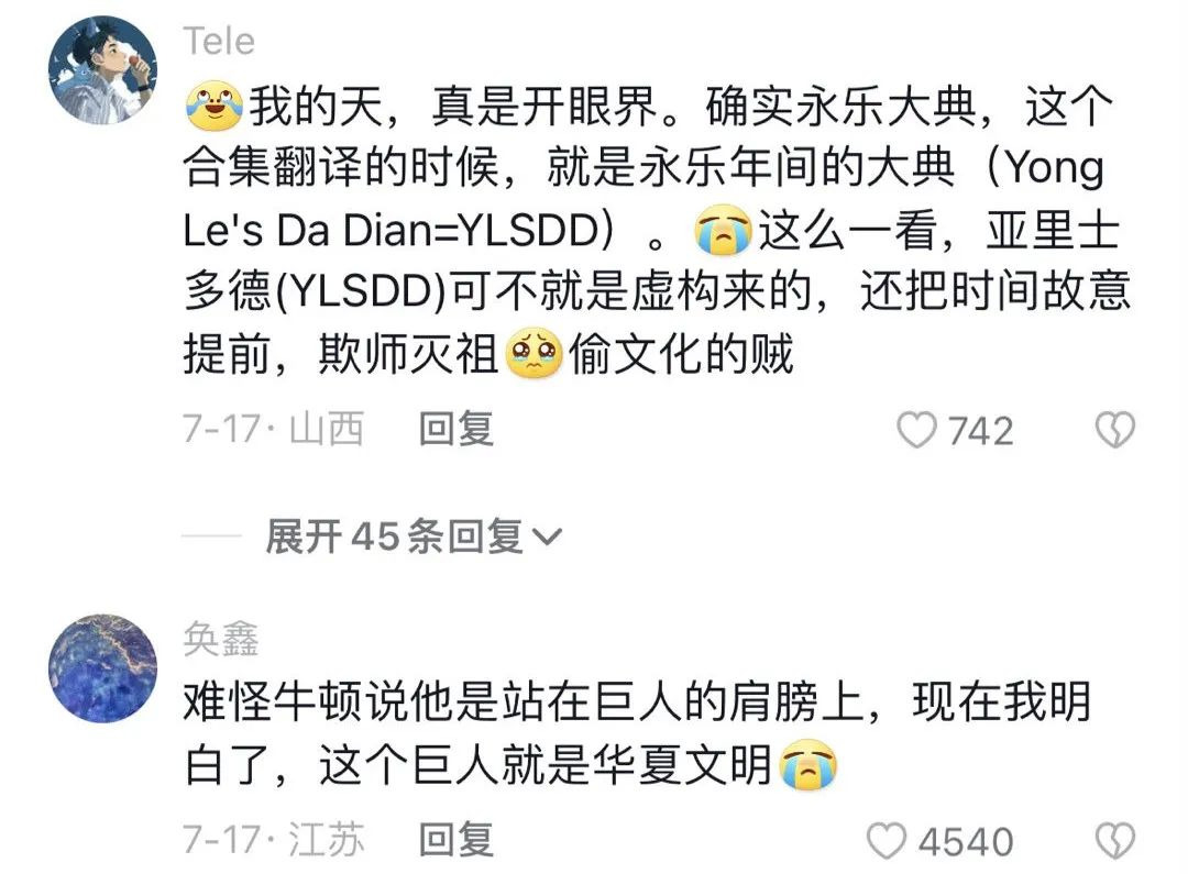 不出意料的,这些视频里也有逻辑上的老毛病。很多视频不分论点,都会加一句,西方文明的成果大爆发,都和中国古籍( 尤其是永乐大典 )的遗失有关。