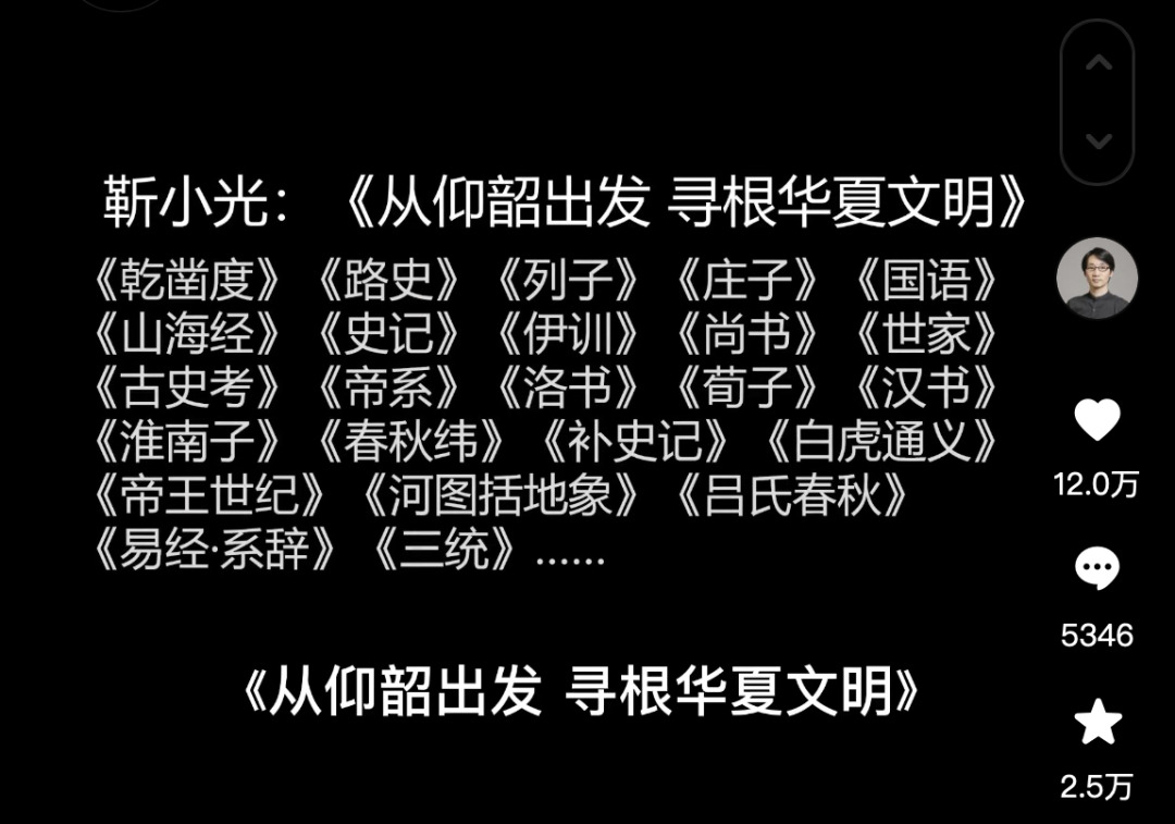 所参考的当代书籍《从仰韶出发 寻根华夏文明》,也曾被网友打假,这本书的作者靳小光(注意这里不是另一位教授兼博导靳晓光),更是被石锤是民科老哥“怀剑听雨”。