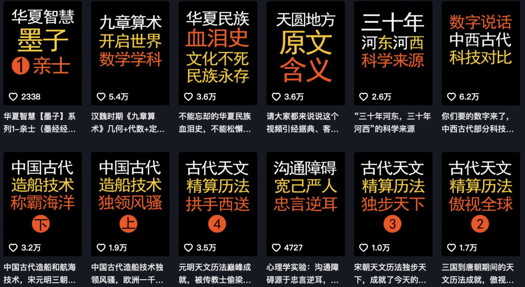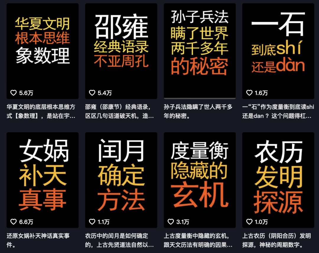 他所有的视频投稿主要分三类,第一类就是上边讲的那些,华夏文明领跑全球的故事。剩下两类,则是对易经国学的简单介绍,以及易经在创业上的运用。