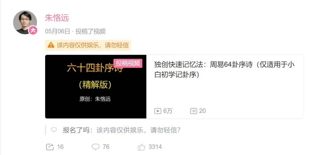 但平台也不会太放纵 “ 西方伪史论 ” ,像是朱恪远,他的视频就被 B 站标注了仅供娱乐,请勿轻信。