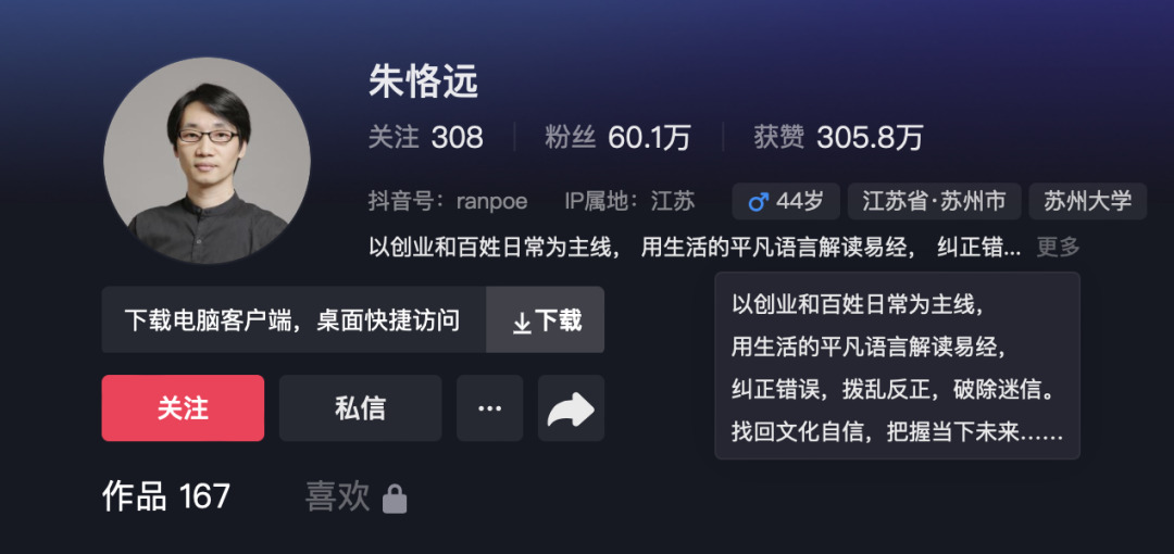 根据他的主页信息来看,已经年近半百的他,似乎曾是苏州大学的高材生,喜欢钻研易经,致力于找回你滴文化自信。