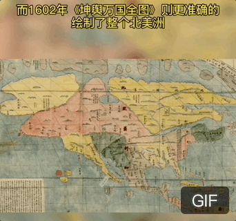 紧接着,他又拿出 1602 年大明绘制的《 坤舆万国全图 》做对比,一口咬定老祖宗比西方人,更早了解北美地理。