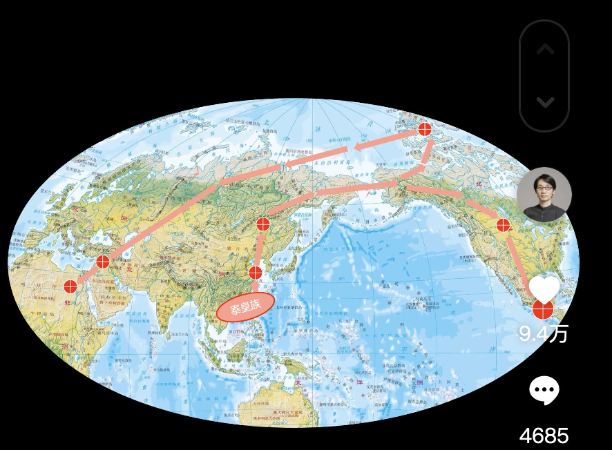 为了佐证这个观点,他大胆开麦,说当时女娲、伏羲几批人干了一架,输家被赢家从中国东南,一路撵到了墨西哥。之后有些人偷偷回家,结果走过站走到了叙利亚,有一波还溜到了非洲,成了古埃及人。