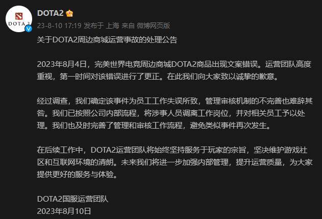 《Dota2》国服运营团队表示,在事发后他们第一时间对错误进行了更正,并对玩家们致以诚挚的歉意,经过调查,该事件为员工工作失误所致,管理审核机制的不完善也难辞其咎,目前已按照内部流程将相关人员调离工作岗位,并对相关员工予以处理,今后他们将加强管理和审核,避免类似事件再次发生。