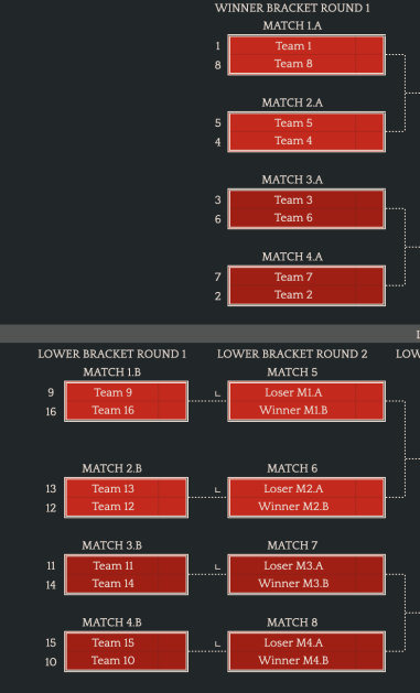 按照夏季赛成绩,其中排名前8的队伍处于胜者组(A级第1名>S级第7名>A级第2名>S级第8名),其余的队伍处于败者组。