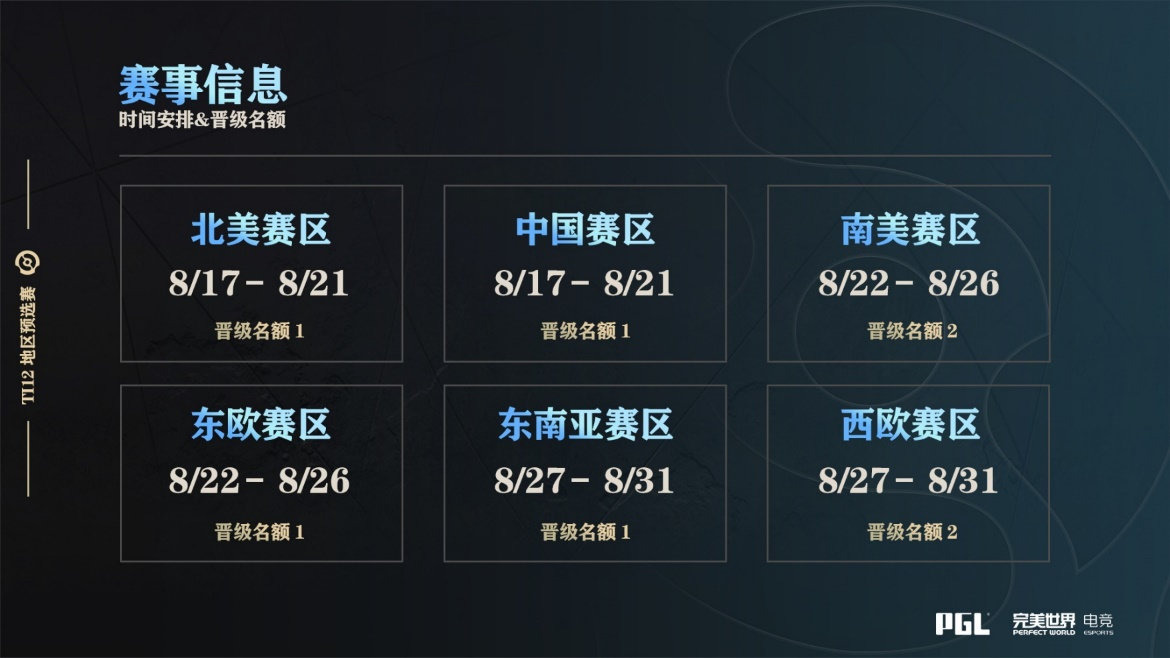 本次TI12地区预选赛共决出8个战队进入到国际邀请赛之路中,其中南美赛区和西欧赛区分别拥有2个名额,其余赛区各有1个名额。