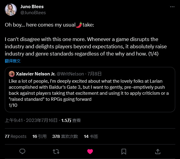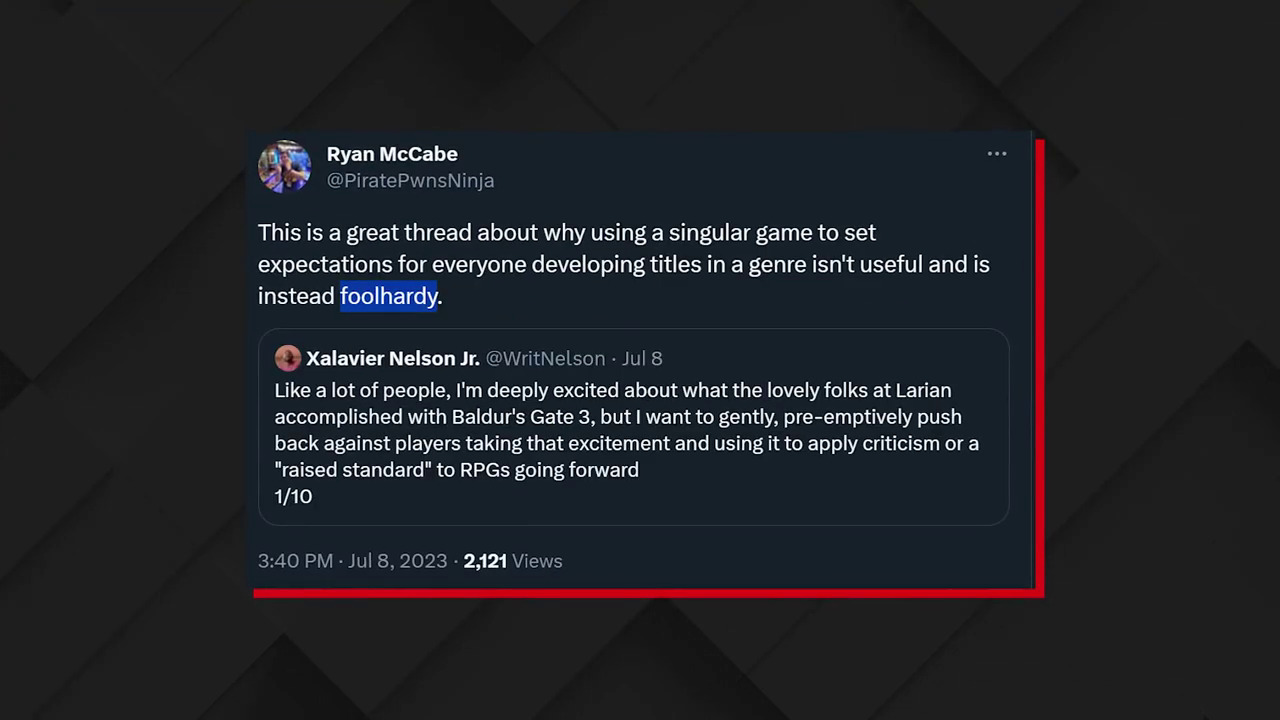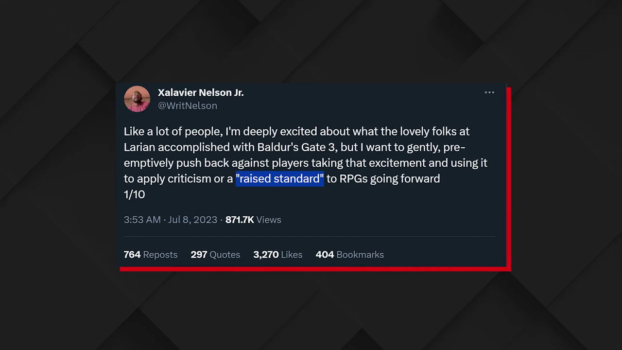 6月,在推特上开发者 Xalavier Nelson Jr.“提醒”玩家“不要将《博德之门3》作为未来 RPG 游戏提升业界标准”。这款“推出即是完整游戏”的作品显然触动了某些人的神经。而游戏开发者的回应则引发了许多玩家的不满。