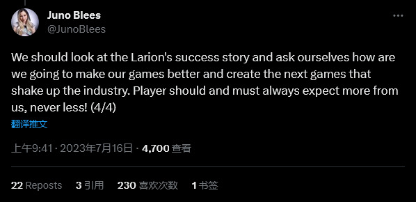 “我们应该看看拉瑞安的成功故事,并扪心自问,我们应该如何让我们的游戏变得更好,并创造出下一个撼动整个行业的游戏。玩家应该而且必须始终对我们抱有更多而不是更少的期望!”