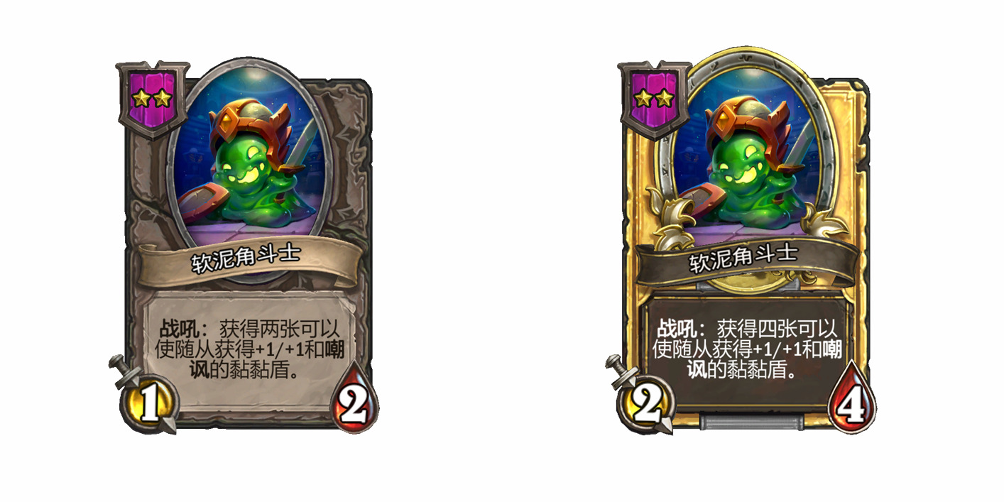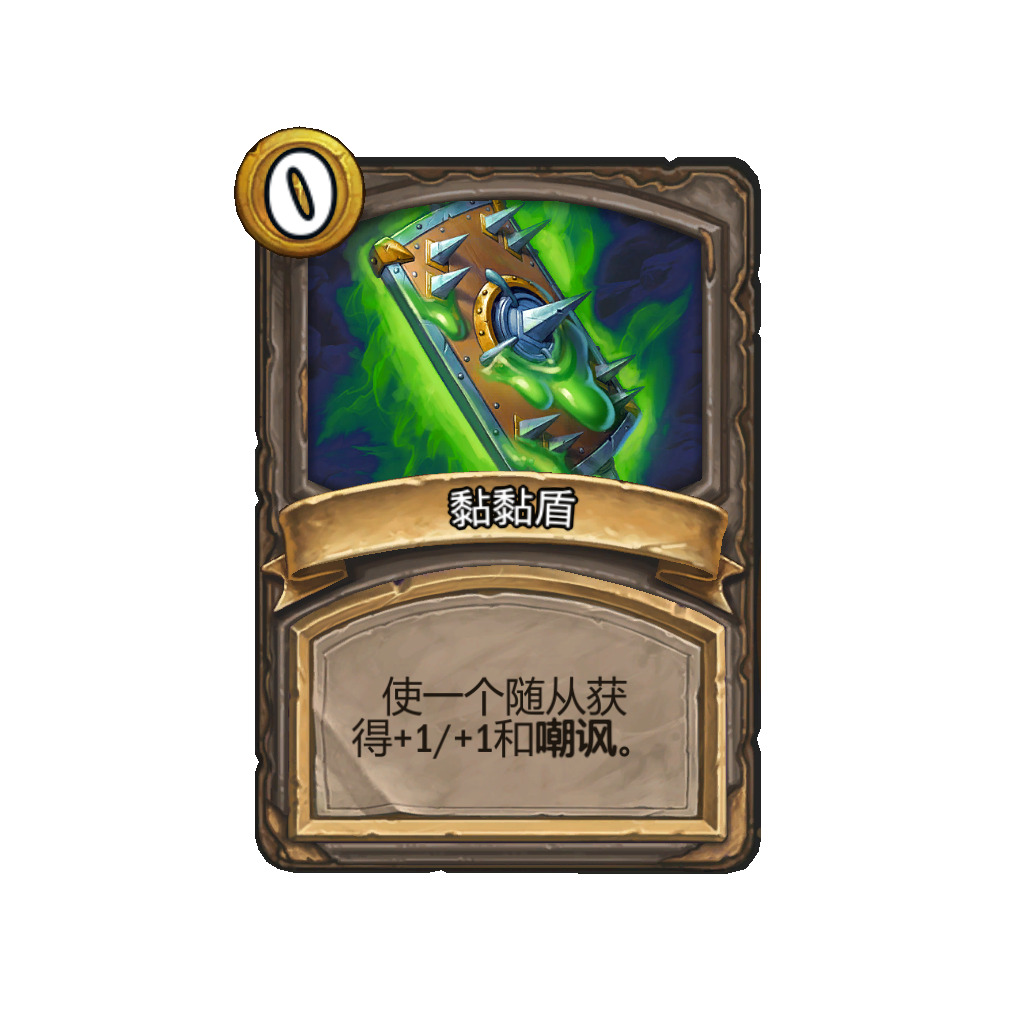 - 2星2/4,战吼:获得两张可以使随从获得+1/+1和嘲讽的黏黏盾